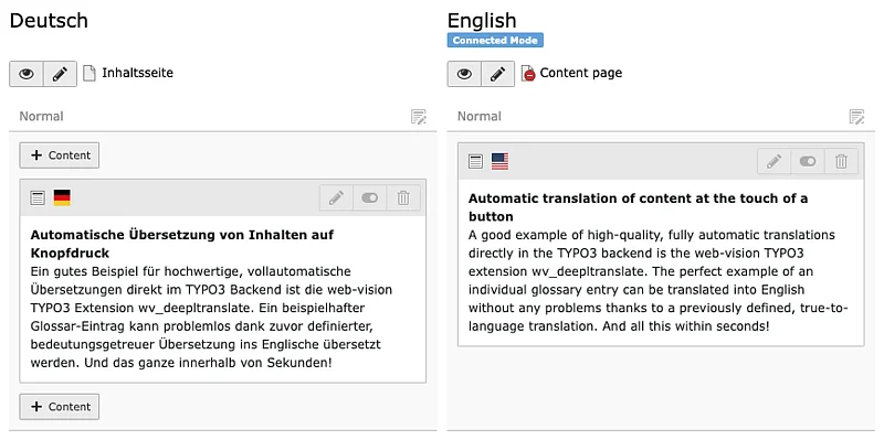Once configured and activated, the renew translation ensures that linked translations of pages and content elements are updated with DeepL as soon as the original content element is changed and saved.