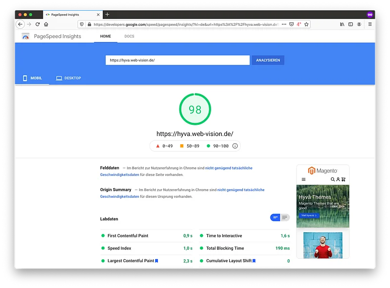 This pays off immediately, even during initial installation, without major adjustments. A demo Hyvä store immediately achieves a mobile score of over 80 points in the Google Pagespeed Check without any effort. On desktop computers, the score is already 98 out of 100 points.