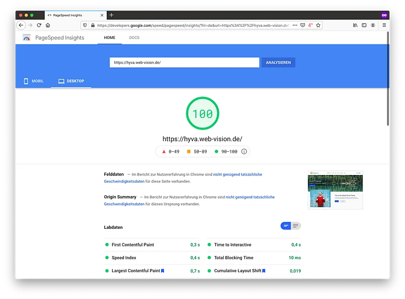 By making an adjustment on the server, we were even able to achieve mobile scores of 98/100 and desktop scores of 100/100 in Google Pagespeed Insights for our Hyva demo store within a few minutes.