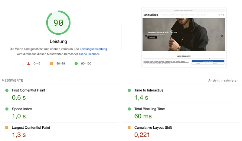 Once again, this project shows the positive effects that the use of our optimized Hyvä theme has on the pagespeed. Without further optimization measures, 90 out of 100 possible points are already achieved in the desktop view!