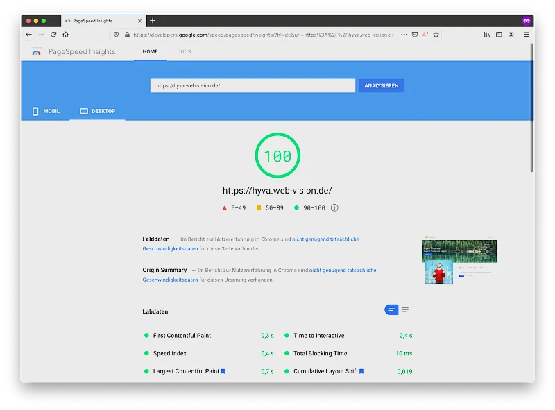 Dies zahlt sich umgehend, bereits bei Erst-Installation, ohne große Anpassungen deutlich aus. Ein Demo-Hyva-Shop erreicht damit ohne Aufwand sofort einen Mobile-Score von über 80 Punkten im Google Pagespeed Check. Auf Desktop-Rechnern liegt der Score bereits bei 98 von 100 Punkten.