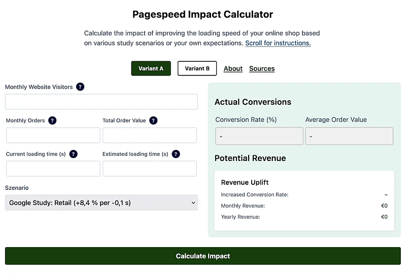 Der PageSpeed Impact Calculator ist ein kostenloses Online-Tool, das es ermöglicht, den potenziellen wirtschaftlichen Nutzen einer verbesserten Ladezeit für Online-Shops zu berechnen. Basierend auf anerkannten Studien, wie der Google-Studie für den Einzelhandel (8,4?% mehr Conversion pro 0,1?s schnellerer Ladezeit) und der Walmart-Analyse (+2?% Conversion pro 1?s schnellerer Ladezeit), können Nutzer individuelle Szenarien durchspielen.