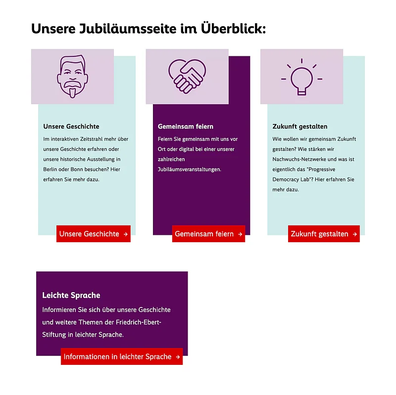 Diese Erkenntnisse bildeten die Grundlage für den geplanten Website-Relaunch. Ziel war es, den Nutzer:innen künftig eine bessere Orientierung zu bieten, indem klar vermittelt wird, wofür die FES steht und welche Angebote sie bereithält.